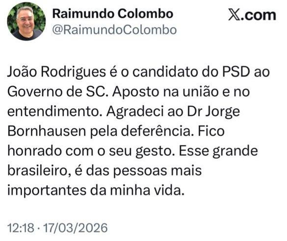 Apesar da declaração de Bornhausen, Colombo adotou um tom conciliador. Em publicação nas redes sociais, afirmou que, neste momento, o pré-candidato do PSD ao governo segue sendo João Rodrigues. O ex-governador também disse acreditar que o partido deve chegar a um entendimento interno nos próximos dias.